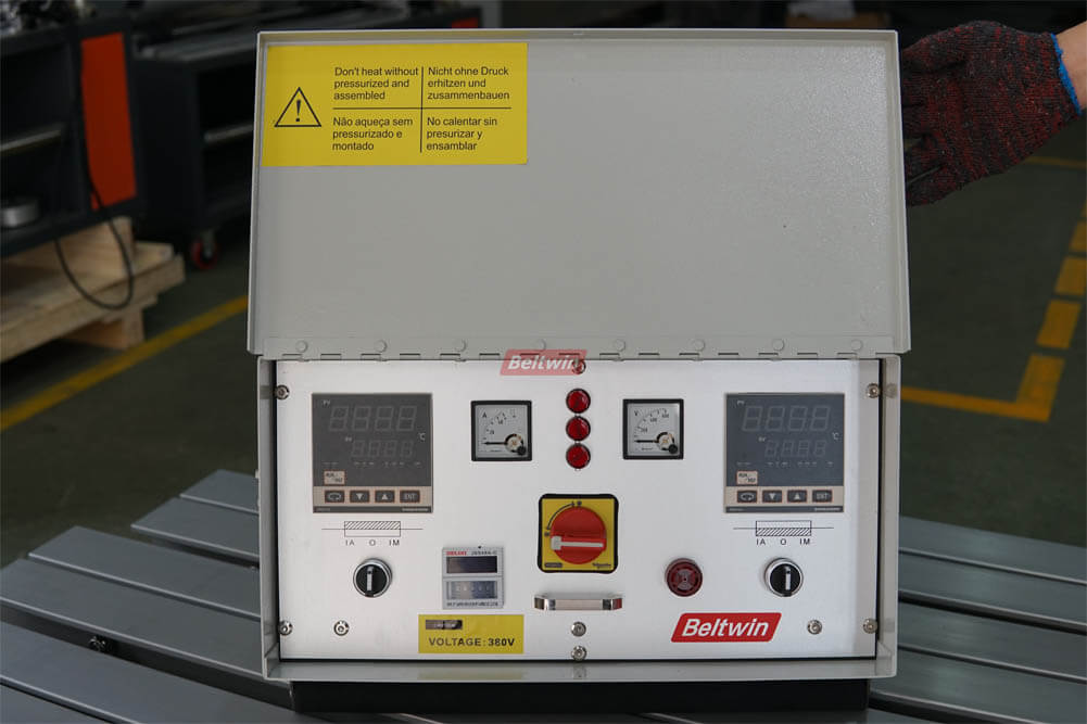 One set control box for 2 pcs platens. After heating temperature of both platens, the dwell time, the cooling temperature and the pressure have been set,the whole splicing process will run automatically. Automatic end-of-cycle buzzer. Include 2 pcs SHIMADEN digital temperature control and indication, 1pc timer, 2 pcs amperemeters and one pc voltmeter. The same standard as Almex, easy exchange by your old Almex vulcanizing press control system. More flexible and save cost. Accurate temperature and read out, CE approved electric components.